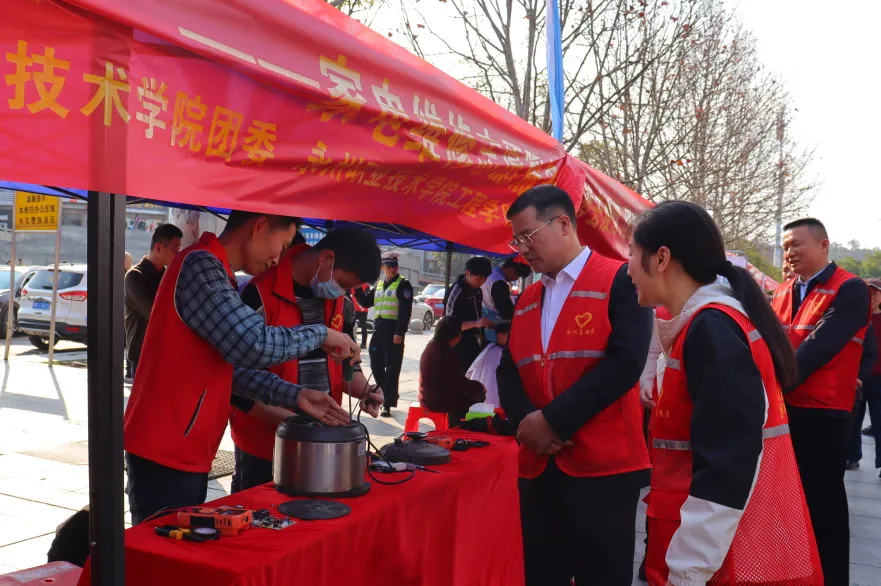 党员教师、学生青年志愿协会以及入党积极分子们迅速行动起来,摆开维修摊位,开始为群众义务维修家电。从电饭锅、音响到各类小家电,大家凭借着扎实的专业知识和精湛的技术,仔细检查每一个故障家电,耐心地进行维修。现场,一位大爷拿着自己无法启动的电饭锅满脸愁容地走过来,党员教师们热情地接过电饭锅,一番检查后,迅速找到了问题所在,经过紧张的维修,电饭锅又重新启动了,大爷脸上露出了满意的笑容,不停地向志愿者们道谢。这样的场景在活动现场不断上演,志愿者们用自己的双手,为群众解决了生活中的实际问题,将温暖传递给每一个人。