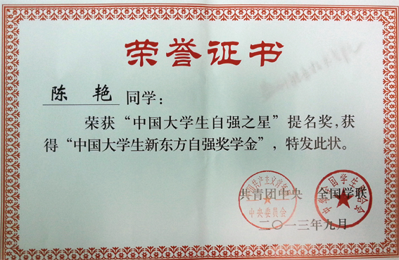 近日,团中央在北京隆重举行2013年“全国大学生自强之星”表彰大会,我院护理系陈艳同学被授予“全国大学生自强之星”提名奖,并获得2000元“中国大学生新东方自强奖学金”。 “寻访中国大学生自强之星”活动由共青团中央、全国学联主办,中国青年报社、中国高校传媒联盟承办,新东方教育科技集团协办,中青在线、中国校媒网、新浪微博、腾讯微博全面跟踪报道。我院陈艳同学凭借“命运桀难矢志不渝、苦中作乐自强不息”的精神感动了媒体和评审委员会,荣获了本次提名奖。陈艳同学的获奖再次彰显了我院青年学生思想政治教育的成效,扩大了我院社会影响力。