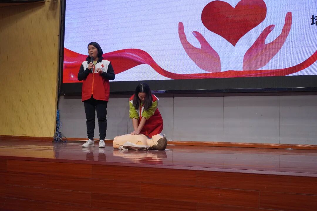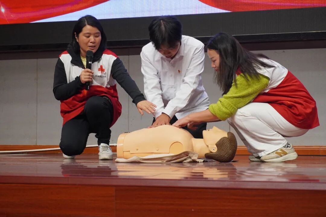 活动第二项,2024年永州市红十字会应急救护培训活动,培训人卢桂云围绕徒手心肺复苏术(CPR)、自动体外除颤仪(AED)和海姆立克法等实操方法及注意事项、突发事件中的防灾避险和现场救护等内容,采取“理论+实操”相结合的方式,为在场的同学们开展应急救护知识和应急救护基本技能培训。此次应急救护培训活动是我校加强校园安全教育、提升学生应急救护能力的重要举措之一。