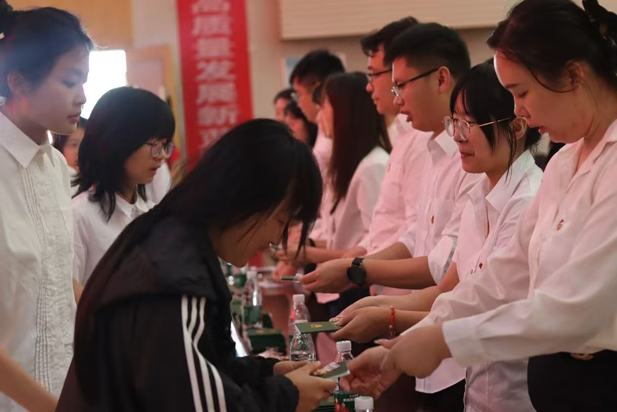 入团仪式在庄严的国歌中顺利展开,大银幕中新团员们的名字随着谢雨佳老师的话语依次呈现,老师们向每一个新团员依次授予团徽团证,并在金言成老师的带领下,新团员庄严宣誓自愿加入中国共产主义青年团,新团员们落座后听取李若琴老师阐述《团章》内容,要求新团员们严于律己,恪尽职守,明确目标,牢记使命!