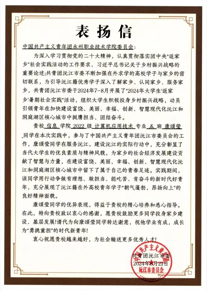 颂莹同学目前担任学校“周末公益”志愿服务项目负责人、信息学院学生会执行主席、信息学院志愿者协会执行会长、班级班长等职务,在学院中积极组织各类活动,受到了广大老师和同学的好评。其作为“周末公益”志愿服务项目负责人组织的相关志愿服务活动受到了共青团湖南省委、红网时刻、新湖南等多家媒体的宣传报道,目前该项活动已入围湖南第七届“雷锋杯”初赛。康颂莹同学还先后获得了2022-2023学年度国家奖学金,湖南省“互联网+”创新创业大赛一等奖、三等奖各一次,湖南省黄炎培职业教育奖产业规划大赛三等奖,市级“优秀青年志愿者”,学校第五届志愿服务大赛一等奖等各类荣誉近四十项。