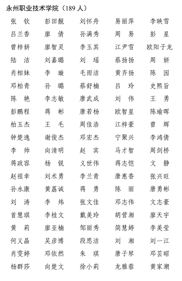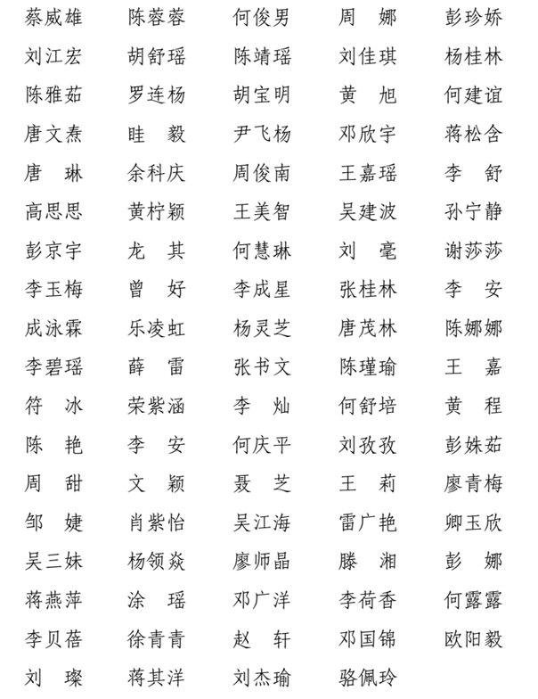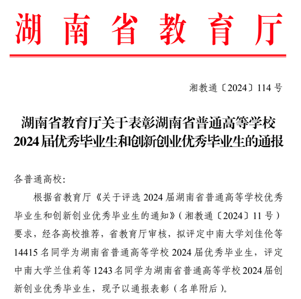 根据省教育厅《关于评选2024届湖南省普通高等学校优秀毕业生和创新创业优秀毕业生的通知》(湘教通〔2024〕11号)要求,经各高校推荐,省教育厅审核,拟评定中南大学刘佳伦等14415名同学为湖南省普通高等学校2024届优秀毕业生,评定中南大学兰佳莉等1243名同学为湖南省普通高等学校2024届创新创业优秀毕业生,现予以通报表彰(名单附后)。