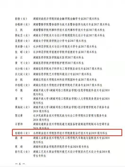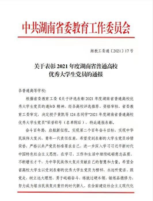 近日,湖南省委教育工委公布了2021年度湖南省普通高校优秀大学生党员评选结果,我校医学技术学院柏丽玲同学获评“2021年度湖南省普通高校优秀大学生党员”荣誉称号。