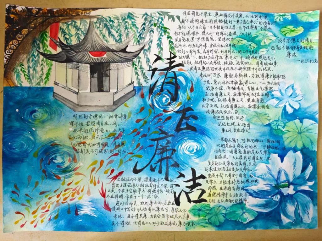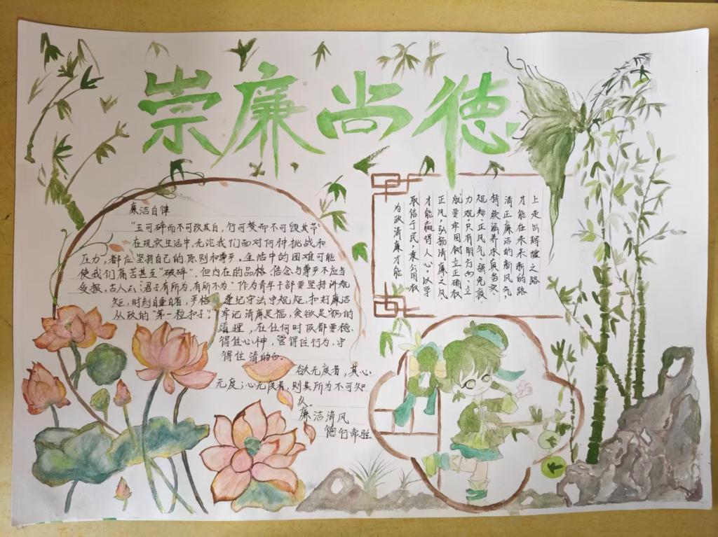 获奖作品不仅是学子创意的结晶,更是廉洁理念的生动传递。如今,一幅幅主题鲜明的手抄报已在主教楼一楼前展出,有的绘莲花寄寓高洁品格,有的书“清廉”诠释初心,每一幅都成为传递清风正气的鲜活载体,让廉洁精神在校园的驻足观赏间持续传递、深深扎根。
