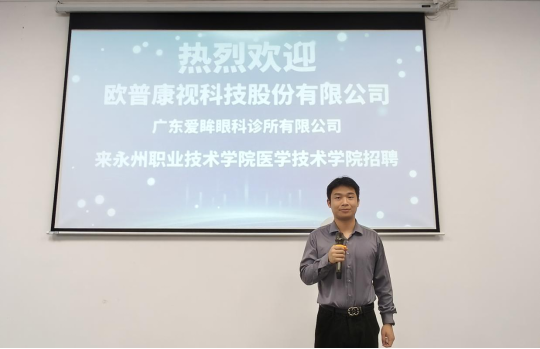 2025年4月10日晚,永州职业技术学院医学技术学院第八报告厅灯火通明,广东爱眸眼科诊所有限公司(欧普康视科技集团成员企业)专场招聘会在此盛大举行。活动以“职引未来·校友同行”为主题,通过企业宣讲、校友故事分享、现场招聘三大环节,为110余名眼视光技术专业学子带来了一场沉浸式职业发展赋能盛宴。