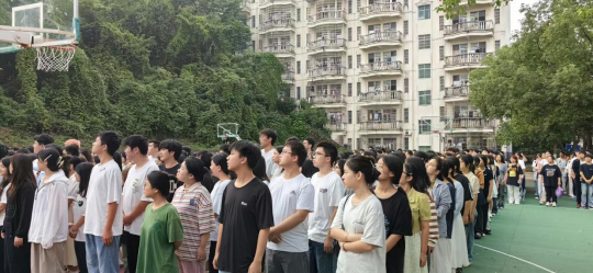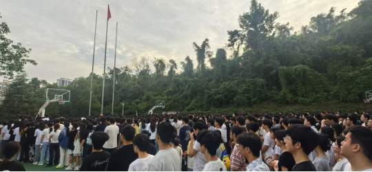 迎着朝阳,国旗护卫队队员迈着铿锵有力的步伐护送国旗入场。在雄壮的《义勇军进行曲》中,五星红旗冉冉升起,全体师生肃立行注目礼,齐唱国歌,爱国情怀在晨光中激荡。